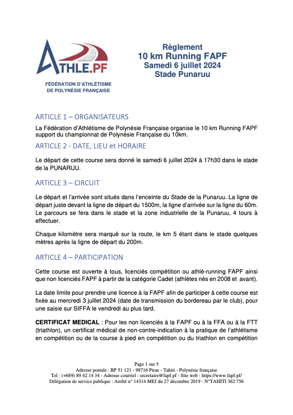 Le 10km RUNNING FAPF, support du Championnat de Polynésie 2024, aura lieu le samedi 6 juillet, départ à 17h30 au stade de la Punaruu.